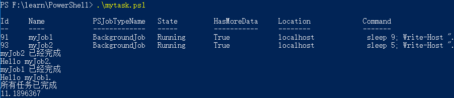 Remove-Job *#測試計(jì)時(shí)開始$start_time = (Get-Date)Start-Job -ScriptBlock { sleep 9; Write-Host "Hello myJob1."; } -Name "myJob1"Start-Job -ScriptBlock { sleep 5; Write-Host "Hello myJob2."; } -Name "myJob2"$taskCount = 2while($taskCount -gt 0){ foreach($job in Get-Job) { $state = [string]$job.State if($state -eq "Completed") { Write-Host($job.Name + " 已經(jīng)完成") Receive-Job $job $taskCount-- Remove-Job $job } } sleep 1}"所有任務(wù)已完成" #得出任務(wù)運(yùn)行的時(shí)間(New-TimeSpan $start_time).totalseconds把上面的代碼保存到 mytask.ps1 文件中并執(zhí)行: