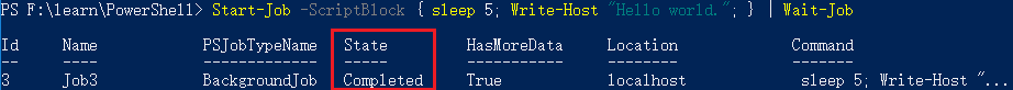 注意:上面的內(nèi)容是由 Wait-Job 命令輸出的,當(dāng)時(shí)任務(wù)的狀態(tài)為 "Completed"。