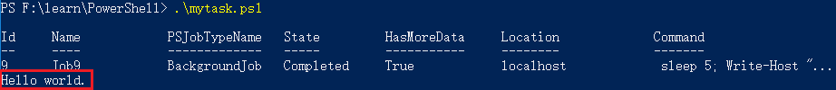 $job = Start-Job -ScriptBlock { sleep 5; Write-Host "Hello world."; }Wait-Job $jobReceive-Job -Job $job把上面的代碼保存到文件 mytask.ps1 中執(zhí)行:
