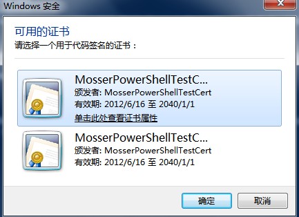 Dir cert:CurrentUserMy | where {$_.subject -eq "CN=MosserPowerShellTestCert"}另一種方法是通過.NET中的內置的對話框進行選擇。將查詢到的證書傳遞給SelectFromCollection()方法,在在作此操作之前必須將證書放在一個特殊的集合中。