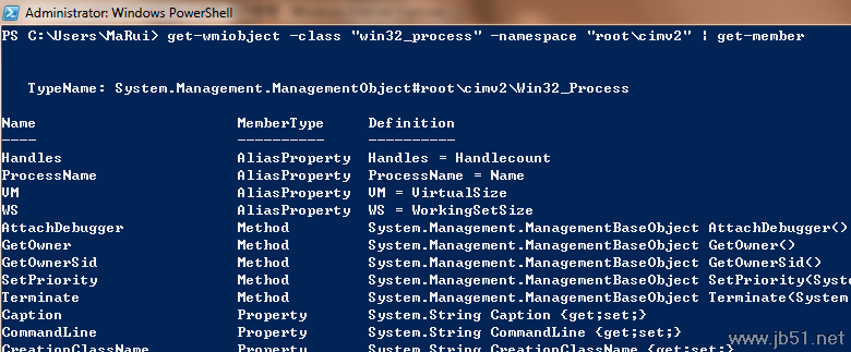 需要具體查看某個(gè)類的成員,使用下面的命令(例如類"win32_process"):