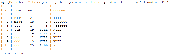 select * from person p left join account a on p.id=a.id and p.id!=4 and a.id!=4;