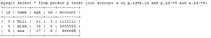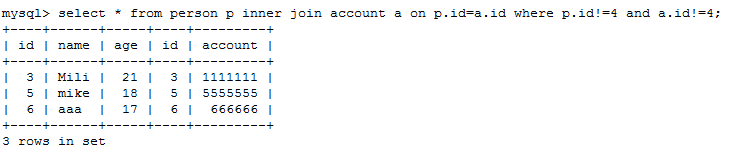 select * from person p inner join account a on p.id=a.id and p.id!=4 and a.id!=4;