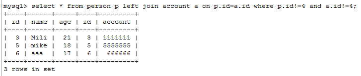 select * from person p left join account a on p.id=a.id where p.id!=4 and a.id!=4;