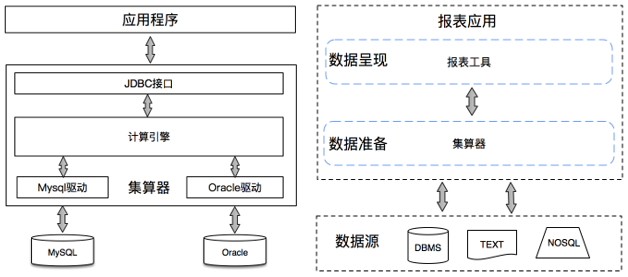 集成后,集算器嵌入報表應(yīng)用層,相當(dāng)于本地的邏輯數(shù)據(jù)庫(不需要單獨服務(wù)器部署),在報表與數(shù)據(jù)源間作為報表數(shù)據(jù)準(zhǔn)備層,完成各種復(fù)雜的計算任務(wù)。