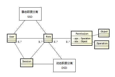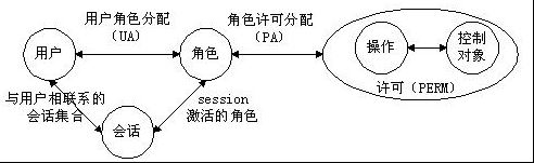 在RBAC之中,包含用戶users(USERS)、角色roles(ROLES)、目標objects(OBS)、操作operations(OPS)、許可權permissions(PRMS)五個基本數據元素,此模型指明用戶、角色、訪問權限和會話之間的關系。
