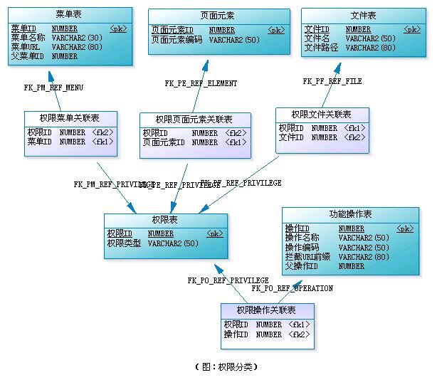 請留意權限表中有一列“權限類型”,我們根據它的取值來區分是哪一類權限,如“MENU”表示菜單的訪問權限、“OPERATION”表示功能模塊的操作權限、“FILE”表示文件的修改權限、“ELEMENT”表示頁面元素的可見性控制等。 這樣設計的好處有二。其一,不需要區分哪些是權限操作,哪些是資源,(實際上,有時候也不好區分,如菜單,把它理解為資源呢還是功能模塊權限呢?)。其二,方便擴展,當系統要對新的東西進行權限控制時,我只需要建立一個新的關聯表“權限XX關聯表”,并確定這類權限的權限類型字符串。