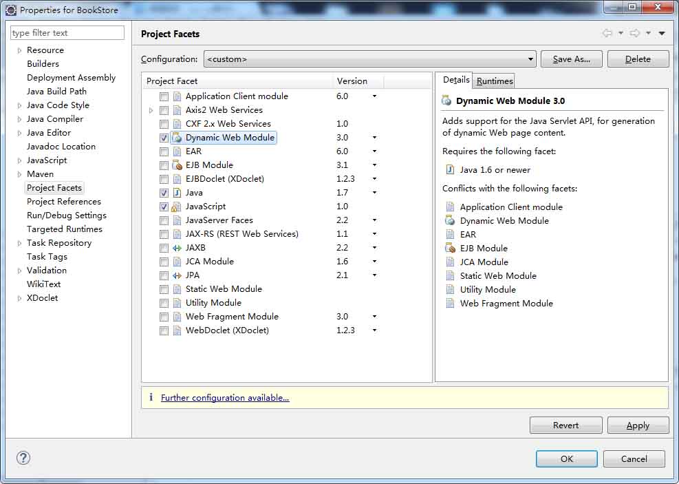1.2、修改層面信息,在項(xiàng)目上右鍵選擇屬性,再選擇“Project Facets”,先設(shè)置java運(yùn)行環(huán)境為1.7,先去掉"Dynamic Web Module"前的勾,然后保存關(guān)閉;再打開勾選上"Dynamic Web Module",版本選擇“3.0”;這里在左下解會(huì)出現(xiàn)一個(gè)超鏈接,創(chuàng)建“Web Content”,完成關(guān)閉。