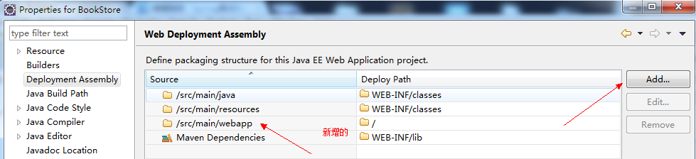 1.3、修改項(xiàng)目的部署內(nèi)容。項(xiàng)目上右鍵屬性,選擇“Deplyment Assembly”,刪除不需要發(fā)布的內(nèi)容如:帶“test”的兩個(gè)目錄,WebContent目錄,再添加一個(gè)main下的webapp目錄。