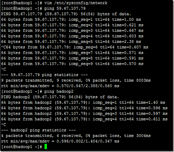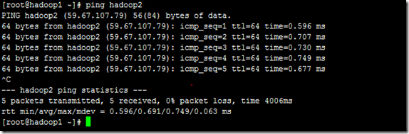 例如:機器為"hadoop1:59.67.107.80"對機器為"hadoop2:59.67.107.79"用命令"ping"記性連接測試。測試結果如下: