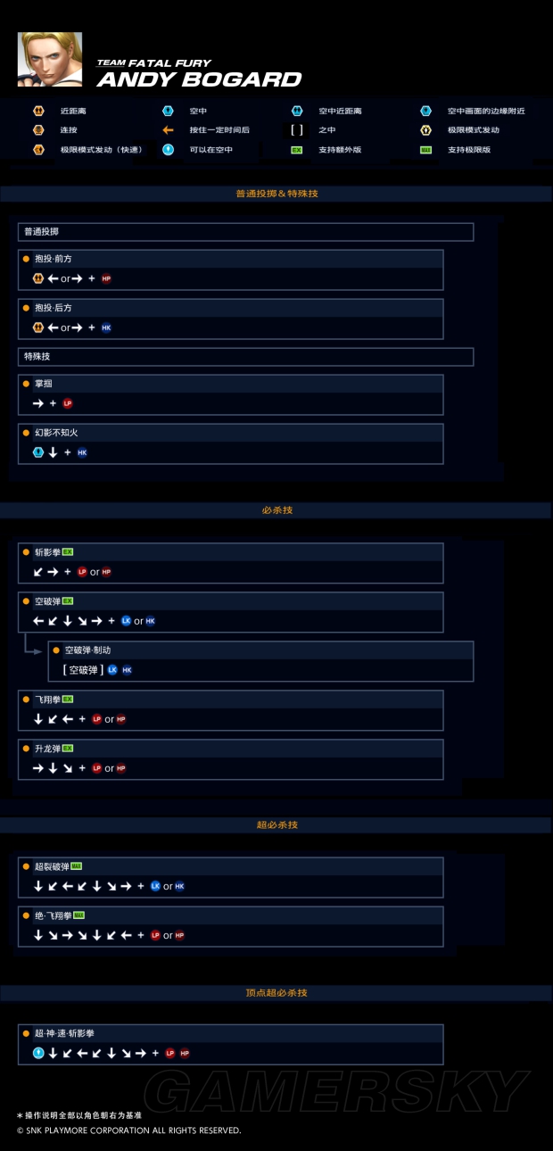 以上就是拳皇14安迪·博加德出招表及背景資料一覽的全部內容了,希望對大家有所幫助。如果大家想了解更多游戲活動與游戲攻略,請持續關注本站,本站小編將在第一時間為大家帶來最好看、最好玩、最新鮮的游戲資訊。更多精彩內容,盡在本站!