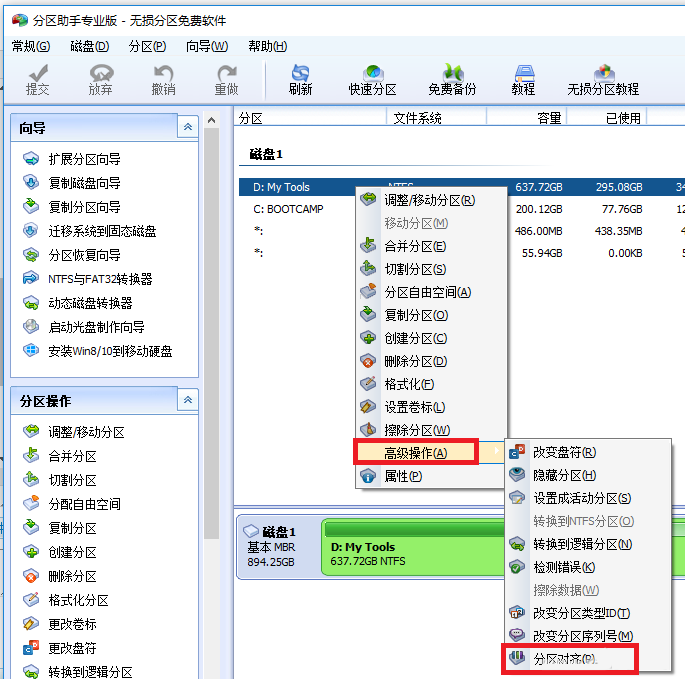 小編也是有招快速無損4K對齊。先安裝下“分區(qū)助手”,之后鼠標右鍵選擇某個需要對齊的盤符,依次進入“高級操作-分區(qū)對齊”。