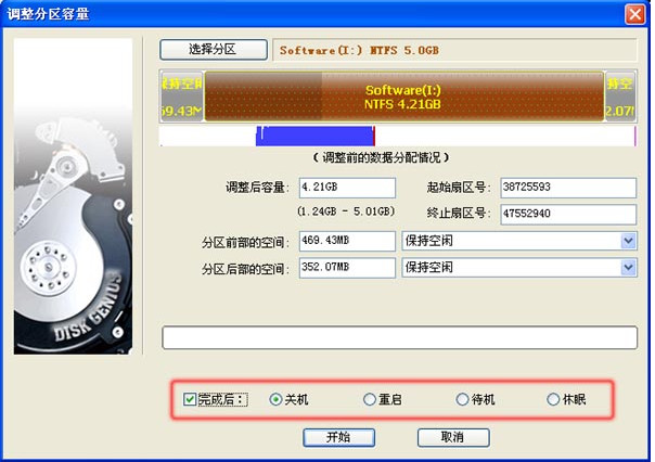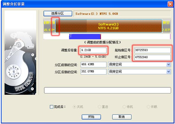 2、調(diào)整分區(qū)大小時,DiskGenius支持鼠標(biāo)操作,可以用鼠標(biāo)改變分區(qū)大小,移動分區(qū)位置,切換調(diào)整后空間的處理選項等;也可以直接指定調(diào)整后的分區(qū)大小,對于有特殊要求的用戶,還可以設(shè)置準(zhǔn)確的起始與終止扇區(qū)號,如下圖: