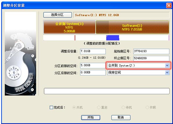 c.按相同的方法,調(diào)整分區(qū)后部的空間,調(diào)整大小為2GB,調(diào)整選項為“合并到K:”,如下圖所示: