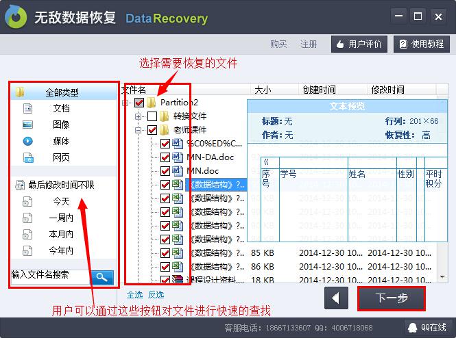 步驟5:選擇需要恢復(fù)的文件,用戶(hù)可以通過(guò)預(yù)覽窗口查看文件是否是自己需要的,然后點(diǎn)擊下一步。