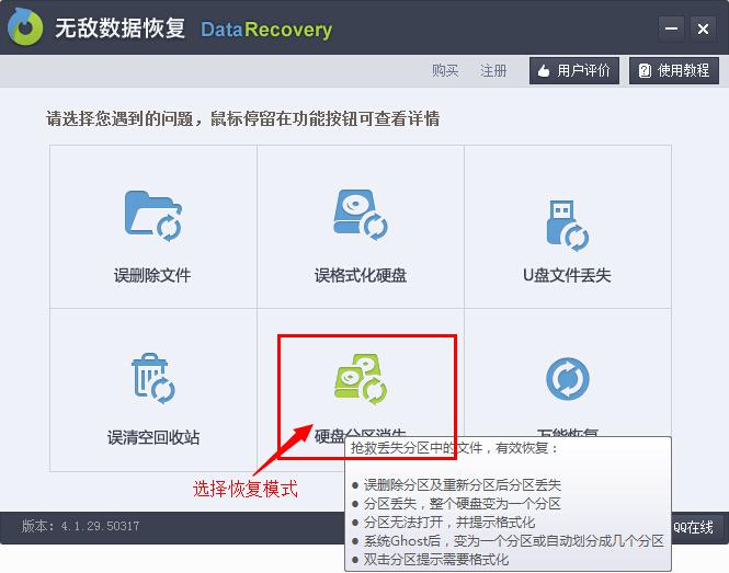 步驟2:雙擊打開(kāi)軟件,選擇“硬盤(pán)分區(qū)消失”恢復(fù)模式,從圖中我們可以看到該模式恢復(fù)的范圍,它可以有效恢復(fù)丟失分區(qū)中的數(shù)據(jù)。