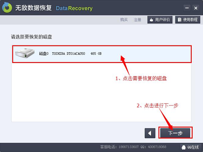 步驟3:按照提示選擇要恢復(fù)的磁盤(pán),這里直接顯示整個(gè)硬盤(pán),選好之后點(diǎn)擊下一步即可。