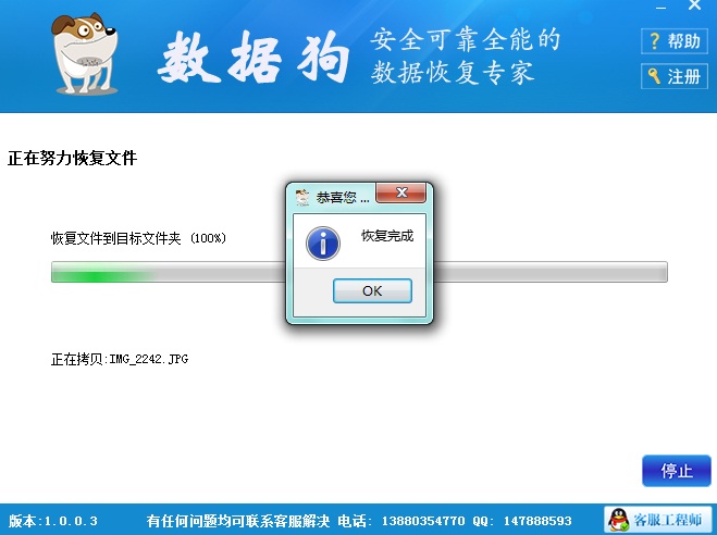 第五步:等待數據恢復完成,完成后點擊OK按鈕,如下圖所示。