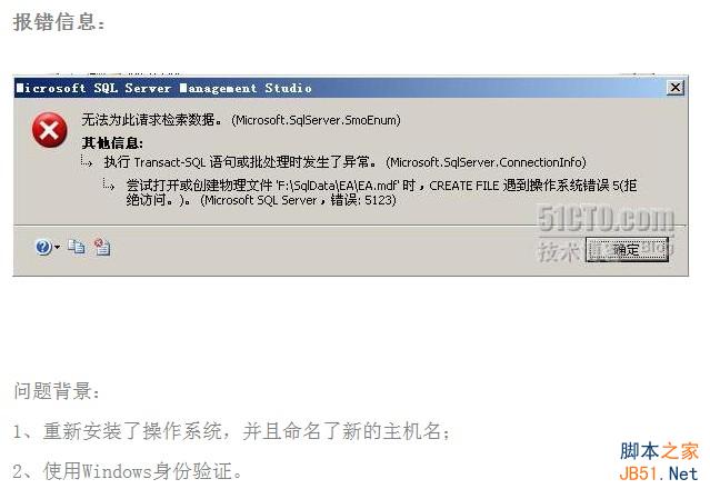 前天重做了系統,重裝了SQLServer2012Express,今天附加一個原來的數據庫時就報錯了,提示信息為:無法為此請求檢索數據……執行Transact-SQL語句或批處理時發生異常……嘗試打開或創建物理文件'd:/data/ejiaOA.mdf'時,createfile遇到系統錯誤 5(拒絕訪問)。(Microsoft SQL Server,錯誤:5123)。