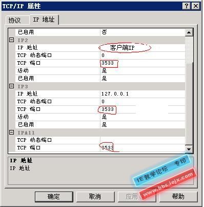 IP2中的地址設(shè)置為客戶(hù)端的IP地址,端口更改為服務(wù)器端SQL SERVER開(kāi)發(fā)的端口。
