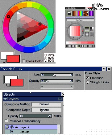 3、新建一個層,調整筆刷的不透明度和尺寸,因為這個筆刷有傾斜度,設置前景色白,背景色紅