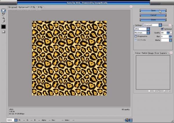 2.按Shift+Ctrl+Alt+S的組合鍵,執(zhí)行Save for Web的指令,把豹紋圖案保存為JPG格式的圖片文件備用,JPG的質(zhì)量選項(xiàng)選擇80就OK了。