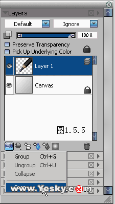 5.保存這個(gè)文件,然后在【Layers】面板中,選擇【Drop】(合并)的命令,合并圖層。(圖1.5.5所示)