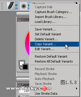 8.捕獲的筆刷出現(xiàn)在了筆刷狀態(tài)欄上,不過默認(rèn)的變體只有同名的一種。我們需要從其他筆刷中復(fù)制一些變體過來,便于修改參數(shù),重新定義新的變體。這里選擇【Charcoal】/【Charcoal】變體,在菜單中選擇Copy Variant(拷貝變體)的命令。(圖1.5.8所示)