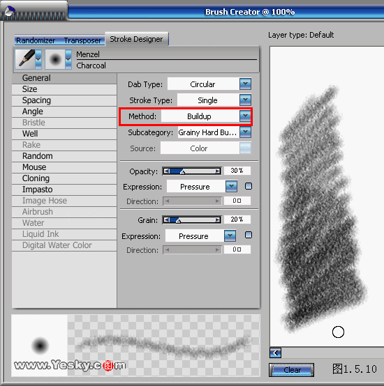 10.【Menzel】在中出現(xiàn)了拷貝過來的【Charcoal】,【CTRL+B】打開【Brush Creator】,進(jìn)行參數(shù)的修改設(shè)定。(圖1.5.10所示)