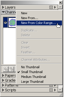 1.打開Channels(通道面板)的三角隱藏菜單,選擇New from color range(從色彩范圍獲得新通道)。