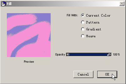 4.在顏色面板中選定新的取代顏色,按CTRL+F打開填充對話框,在Fill with的選項中選擇Current color(當前顏色),按下OK按鈕確定。最后CTRL+D取消選區完成整個替換顏色的操作。