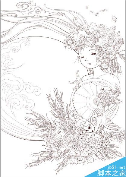 1、花神線稿,先在sai軟件中把線條勾勒好。注意畫面疏密對比和大小對比