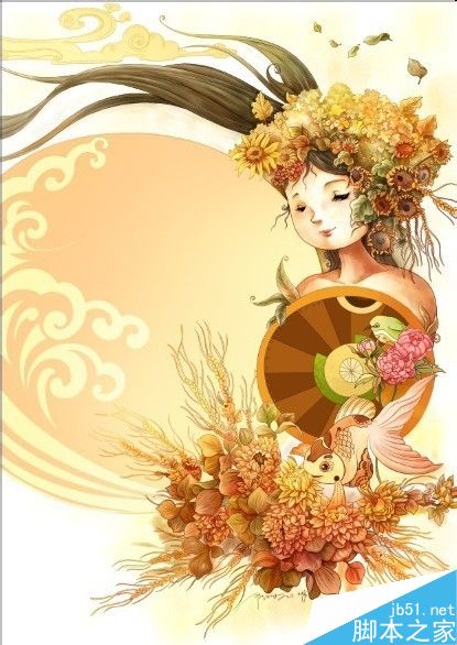 6、把花朵小鳥和金魚按照畫面色調的整體基調刻畫完成。最后收尾,平涂人物前面的圓形幾何體加一些紋理豐富一下,同時把左面的花紋強調出來,注意層次虛實