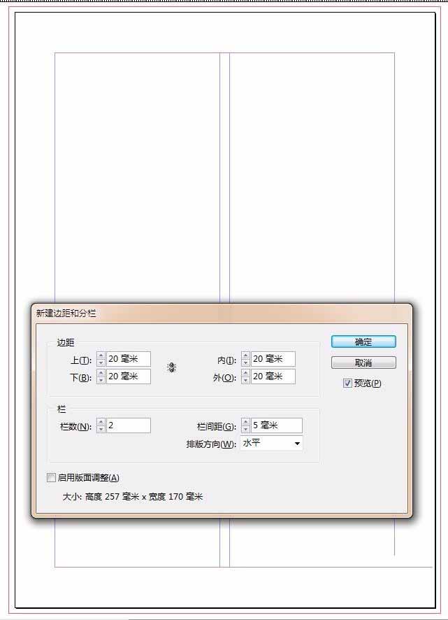3、設置邊距和分欄的時候,已經可以看到將要設置好的樣子。這里設置了邊距各20mm,也就是最里面的大方框。欄數設置了2,欄距設置5mm。在后面的板式中都可以立馬看到。設置參數根據設計而定。確認完成新建文檔。