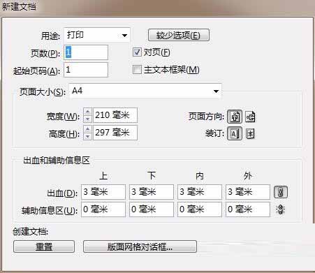 2、已A4單頁為例,設置出血各3mm。還沒有完,還要設置邊距和分欄。點擊進入設置框。