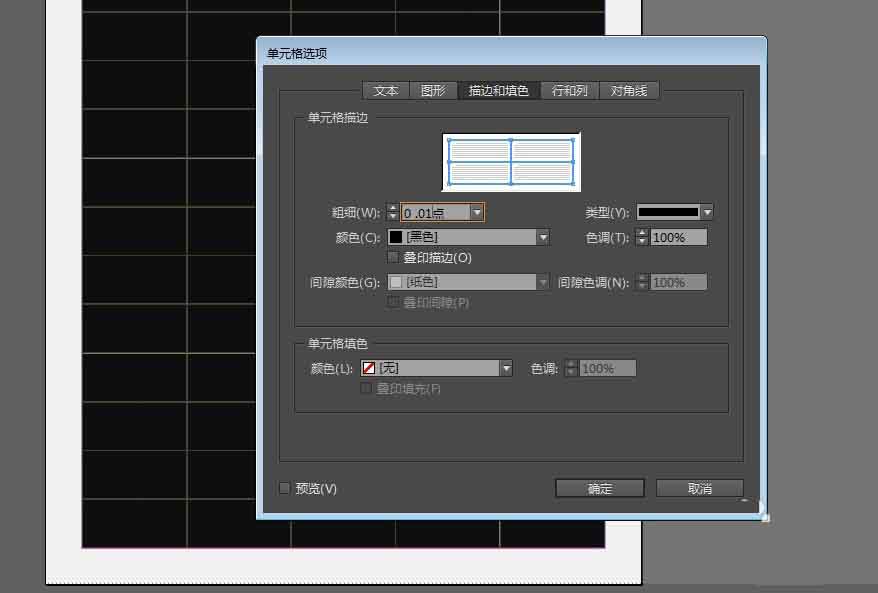 調整描邊需要點擊表—單元格選項——描邊和填色,在這里我們設置描邊粗細為0.01,其他參數可以自己選擇,描邊顏色也可以更換。