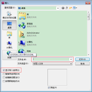 2、點擊置入命令,選擇word文檔,注意左下角選項勾選