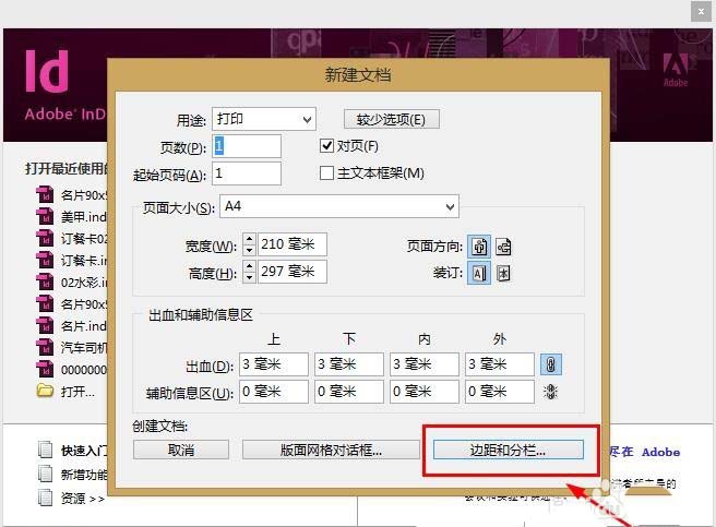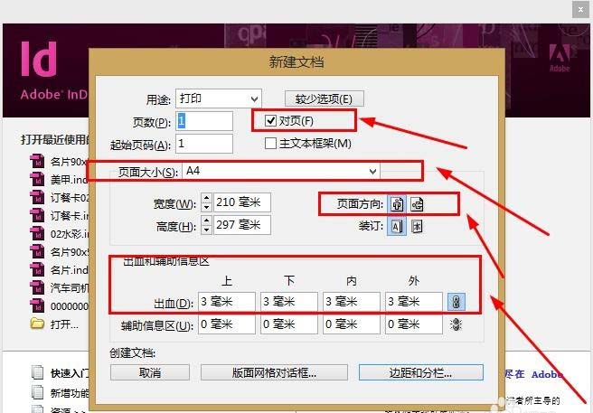 2、出現如下圖片窗口,勾選”對頁“,選擇”頁面大小“(也可以進行自定義),選擇“頁面方向”,選擇出血大小(這個是印刷時留出裁切的范圍)