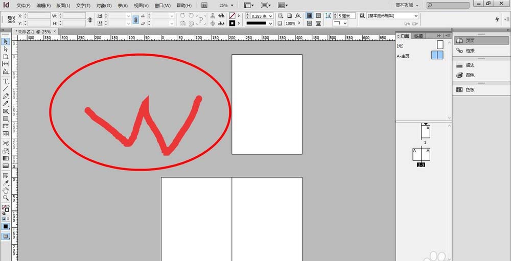 6、點擊“A-主頁”拖動至頁面欄下方增加頁面,如圖所示,如不要周邊白版(這個叫編輯畫面)可以點擊“W”