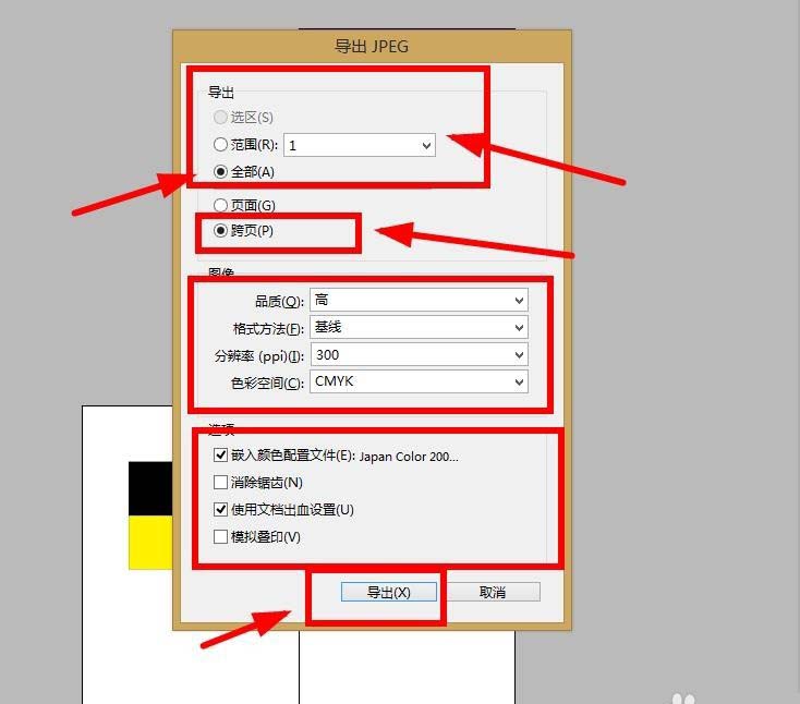 10、出現如下窗口,選擇“全部”或是“范圍”(范圍-可直接單擊輸入要導出的頁面例如:1-3),選擇“跨頁”(如果是“頁面”導出來就是單頁單頁的),底下根據自己需求選擇,然后點擊“導出”