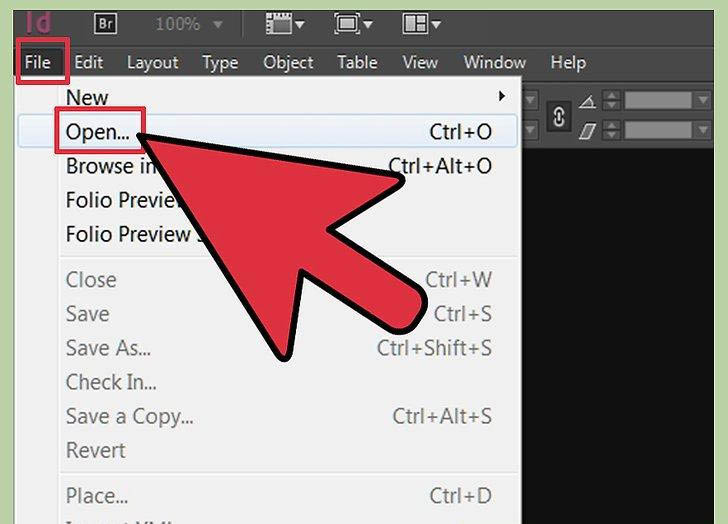 4、打開你想要的工作選擇文件>從控制面板打開在你的工作區(qū)頂部的InDesign文檔。如果你沒有一個(gè)現(xiàn)有的設(shè)計(jì)文件的工作中,通過選擇文件>新建>文件并指定您的新文件的設(shè)置創(chuàng)建一個(gè)新文檔。