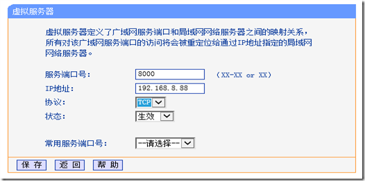 如果是在有路由器的環境下,注意還需要設置端口映射才行哦。我的有經過路由,得在路由將這個8000訪問端口做下端口映射。路由端口映射位置在虛擬服務器目錄,端口號8000,IP地址是路由映射到內網的IP,協議為TCP。