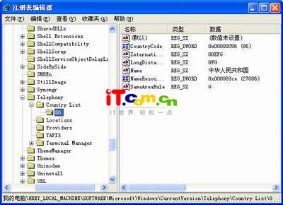 清除國家列表:HKEY_LOCAL_MACHINESoftwareMicrosoftWindowsCurrentVersionTelephonyCountry List分支下保存了系統的國家列表,只需保留86號文件夾“中華人民共和國”即可。