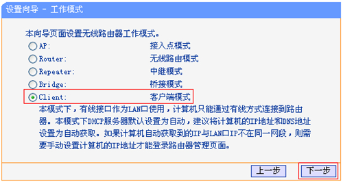 至此,Client模式設置完成。上網電腦通過有線連接到路由器的網線接口即可上網。工作在Client模式下,Mini路由器不發射信號,所以無線終端無法通過Mini路由器上網。