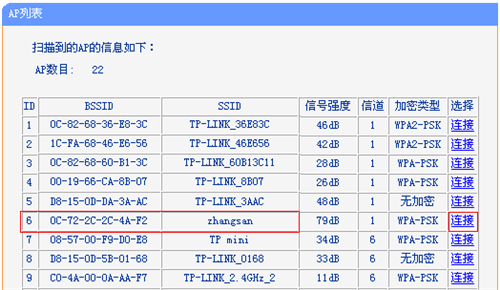 在掃描頁面中找到主路由器的SSID,點擊 連接。