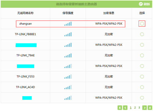 注意:信號(hào)列表可能不止一頁(yè),可以點(diǎn)擊向右箭頭進(jìn)入到下一頁(yè)。如果無(wú)法掃描到主路由器信號(hào),請(qǐng)減小路由器之間的距離或障礙物。