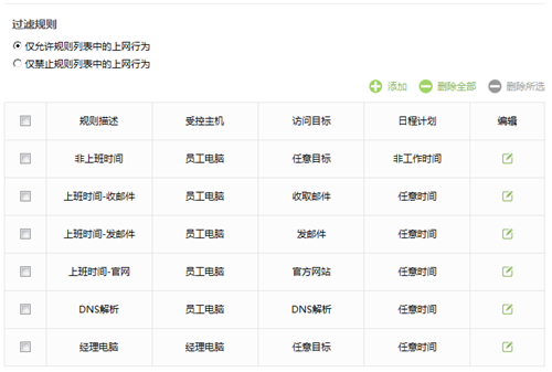 至此,上網(wǎng)控制功能設(shè)置完成。辦公網(wǎng)絡(luò)內(nèi)的所有電腦均會按照設(shè)置的規(guī)則進行上網(wǎng)應(yīng)用。
