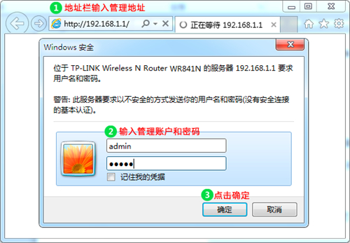 1、操作電腦連接到副路由器的LAN口或無線信號(默認(rèn)為TP-LINK_XXXX),打開瀏覽器,清空地址欄并輸入192.168.1.1,輸入路由器的管理賬號和密碼,默認(rèn)均為admin,登錄管理界面。