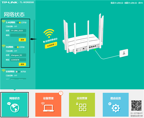 8、雙頻路由器作為副路由器橋接主路由器,在無線橋接過程中我們只配置了一個頻段的無線信號名稱和密碼,還需要配置另外一個頻段。比如使用5G頻段橋接,就需要單獨設置2.4G的無線信號,反之一樣。點擊網絡狀態修改相關設置,如果主路由器也是雙頻路由器,請將信號名稱和密碼設置與主路由器一致,以實現漫游: