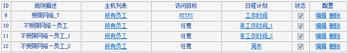 10、依次添加員工在工作時間收發郵件、登錄QQ和非工作時間的訪問規則,設置完成后,總規則如下:
